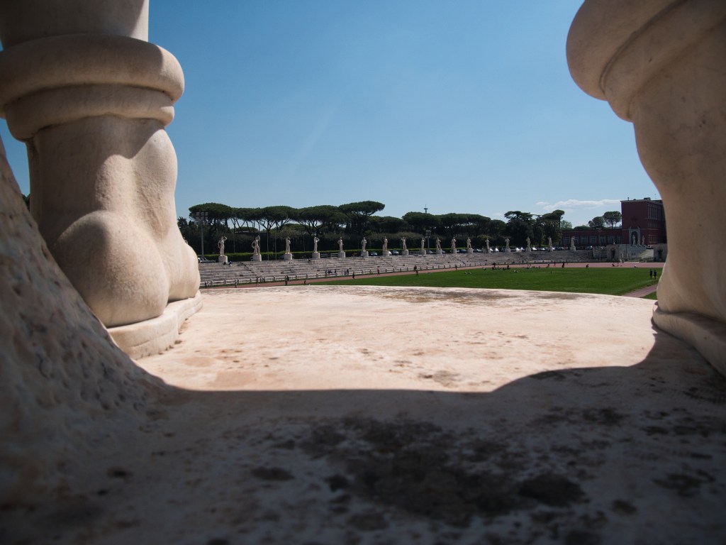 Una ragazza si siede “ai nostri piedi”, leggendo un libro. Noi siamo una statua secolare, che sta lì ferma, immobile da decenni, scolpita nel marmo che riproduce splendide e muscolari fattezze umane, ma noi umani non siamo. Siamo degli antichi atleti, degli antichi guerrieri, che dalla loro altezza e nobiltà statuaria, guardano fissamente uno spazio, un territorio, un panorama, un confine, come fossimo la sua sentinella.