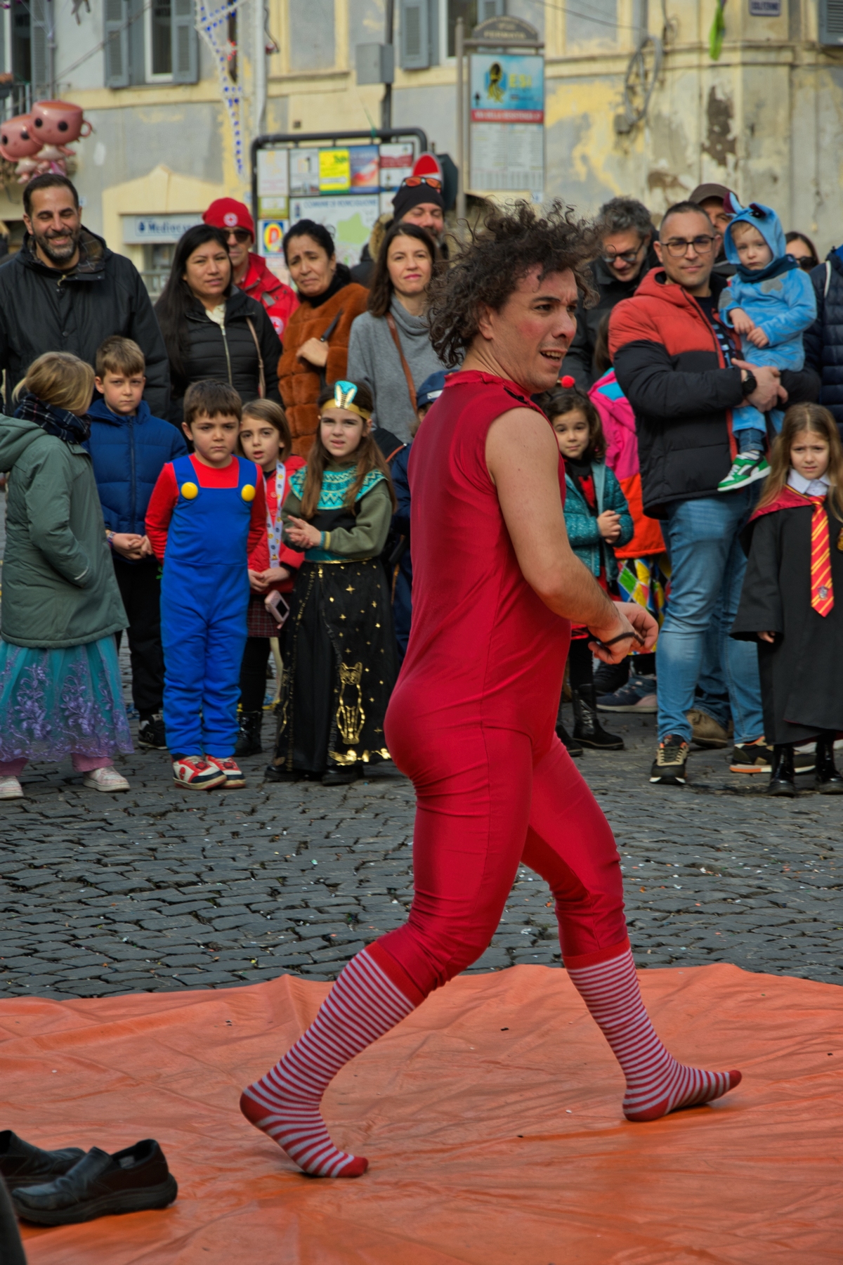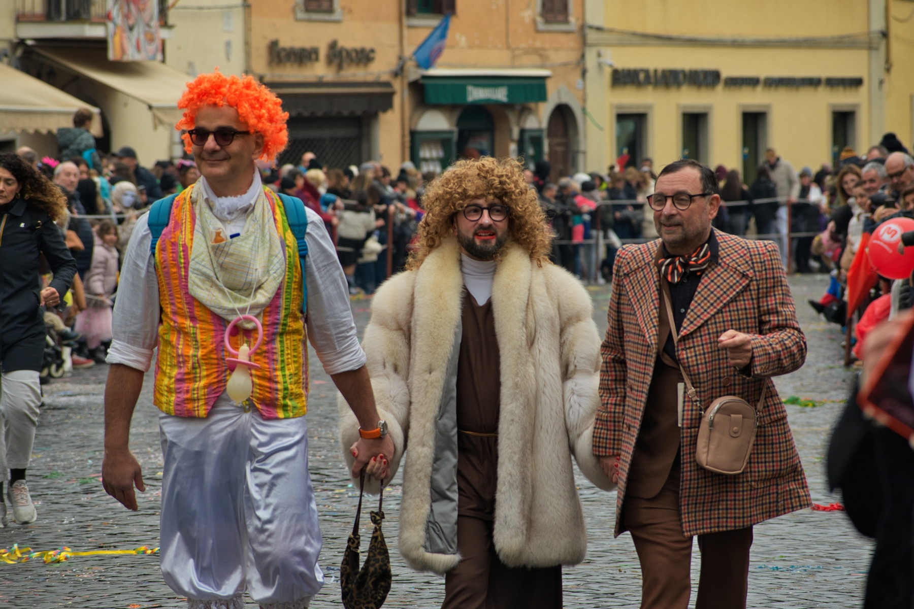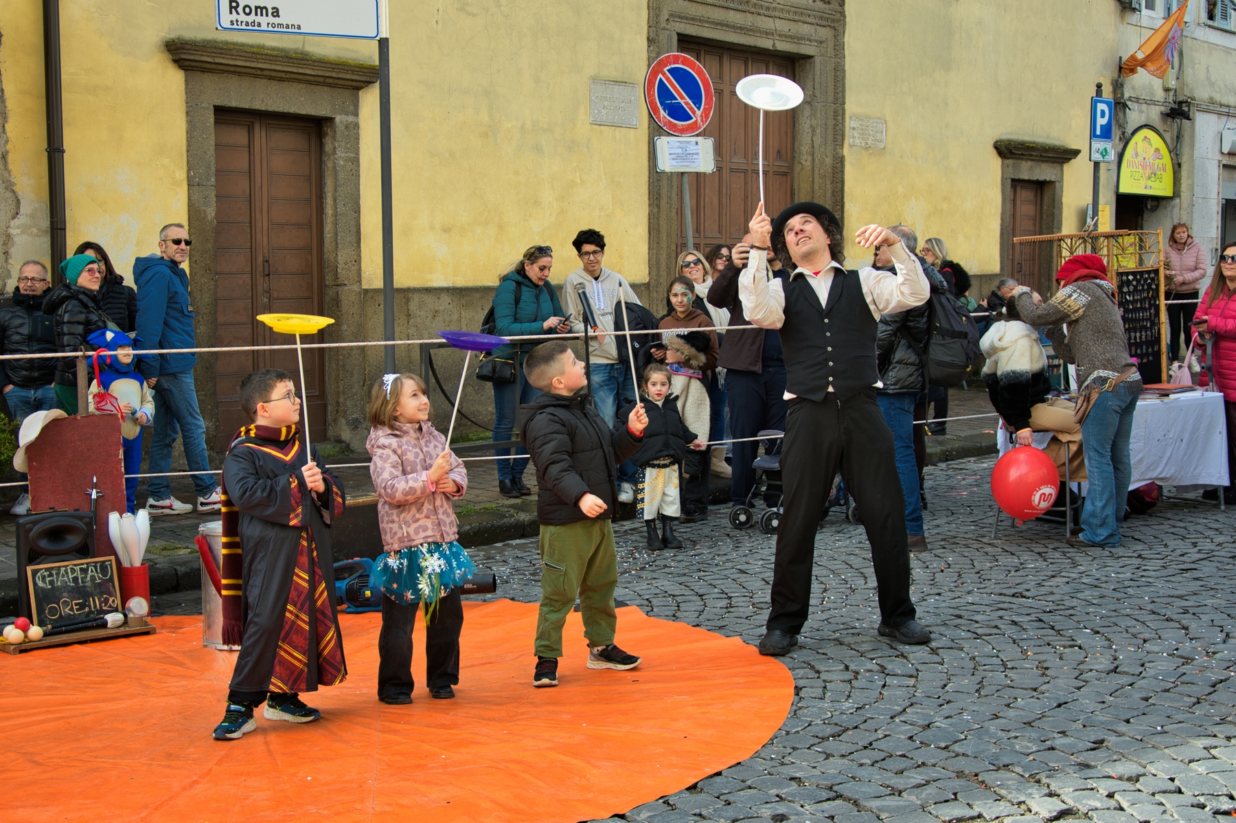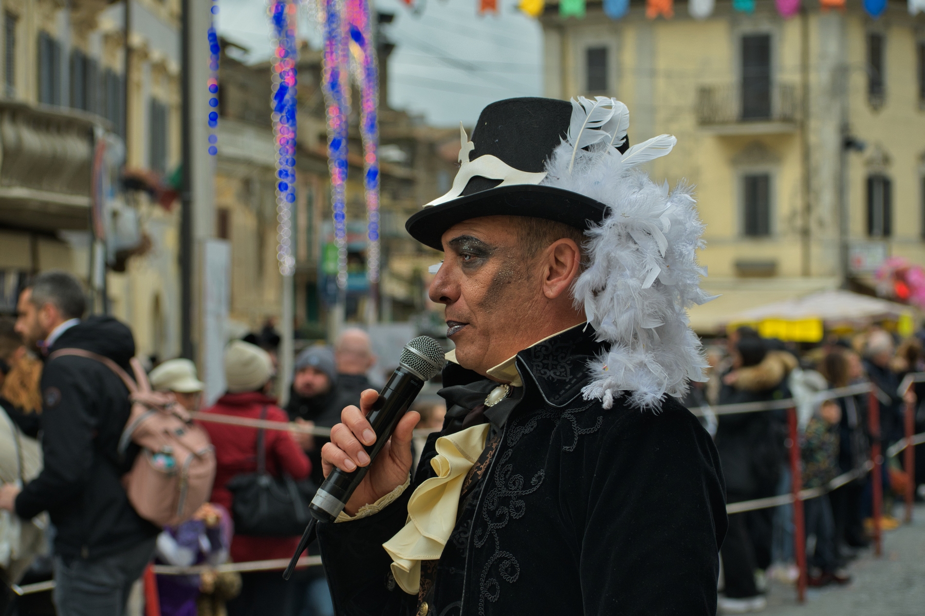 Una giornata carnevalesca, nel bel paese di Ronciglione (Lazio, VT), attendendo la sfilata dei carri e delle maschere, per strada, tra la gente.