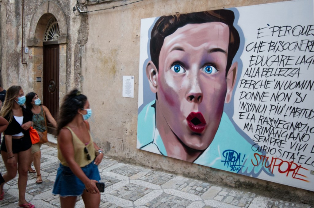 Fotografie scattate in Sicilia, durante un’estate di pausa tra lockdown e quarantene, passanti si abbinano a immagini e disegni sui muri e serrande dei negozi, con un’atmosfera strana e surreale.